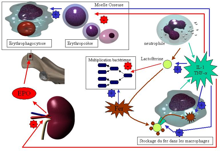 Les signes d'anémie et de microcytose sont plus modérés que dans le cas précédent. L'anémie est due à une ségrégation du fer dans les macrophages. En conséquence :