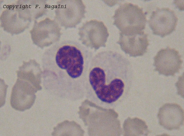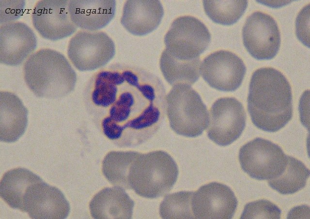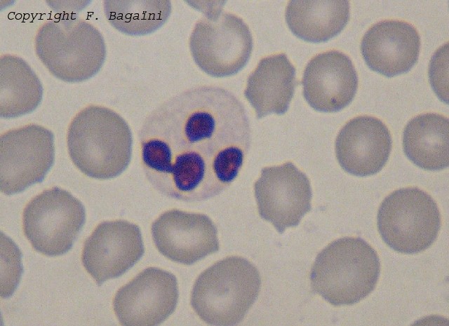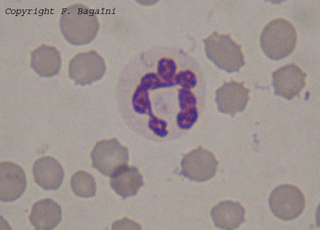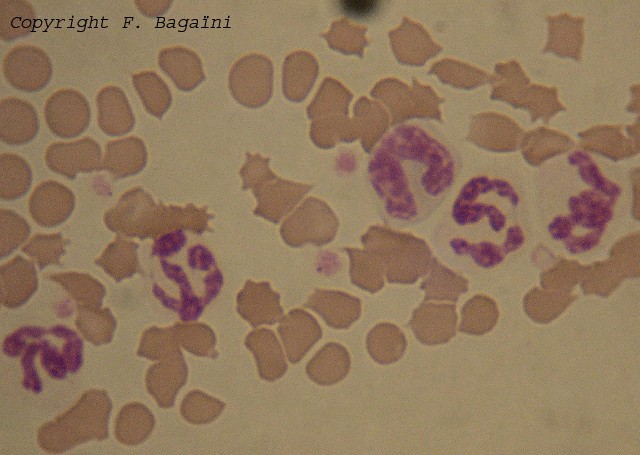 Ces neutrophilies s'accompagnent d'une hypersegmentation, c'est à dire plus de 5-6 lobes chez le chien et le chat. L'hypersegmentation correspond à un processus de viellissement des neutrophiles du à un défaut de margination et de diapédèse. Cette situation se rencontre notamment lors de :